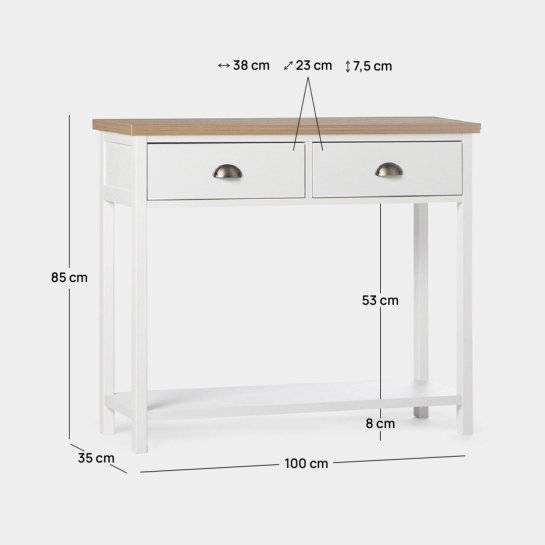 Das Vorzimmermöbel Marais im modernen Stil ist das ideale Stück, um die Einrichtung in Ihrem Eingangsbereich zu vervollständigen. In den beiden geräumigen Schubladen können Sie die Sachen aufbewahren, die Sie beim Verlassen und Betreten des Hauses griffbereit haben möchten. Für eine höhere Stabilität des Möbels empfehlen wir eine Befestigung an der Wand. Kombinieren Sie es mit anderen Stücken aus der Kollektion und erhalten Sie den kompletten Look.