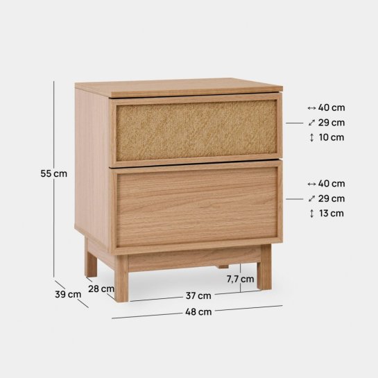 Der Nachttisch Bora aus Holz in der Farbe Natur und Naturfaser ist die perfekte Option, wenn Sie ein warmes und gemütliches Schlafzimmer schaffen möchten. Seine zwei geräumigen Schubladen bieten den perfekten Stauraum, um Ihre persönlichen Sachen diskret aufzubewahren. Kombinieren Sie ihn mit den anderen Möbeln aus der Kollektion und erhalten Sie einen kompletten und harmonischen Look.