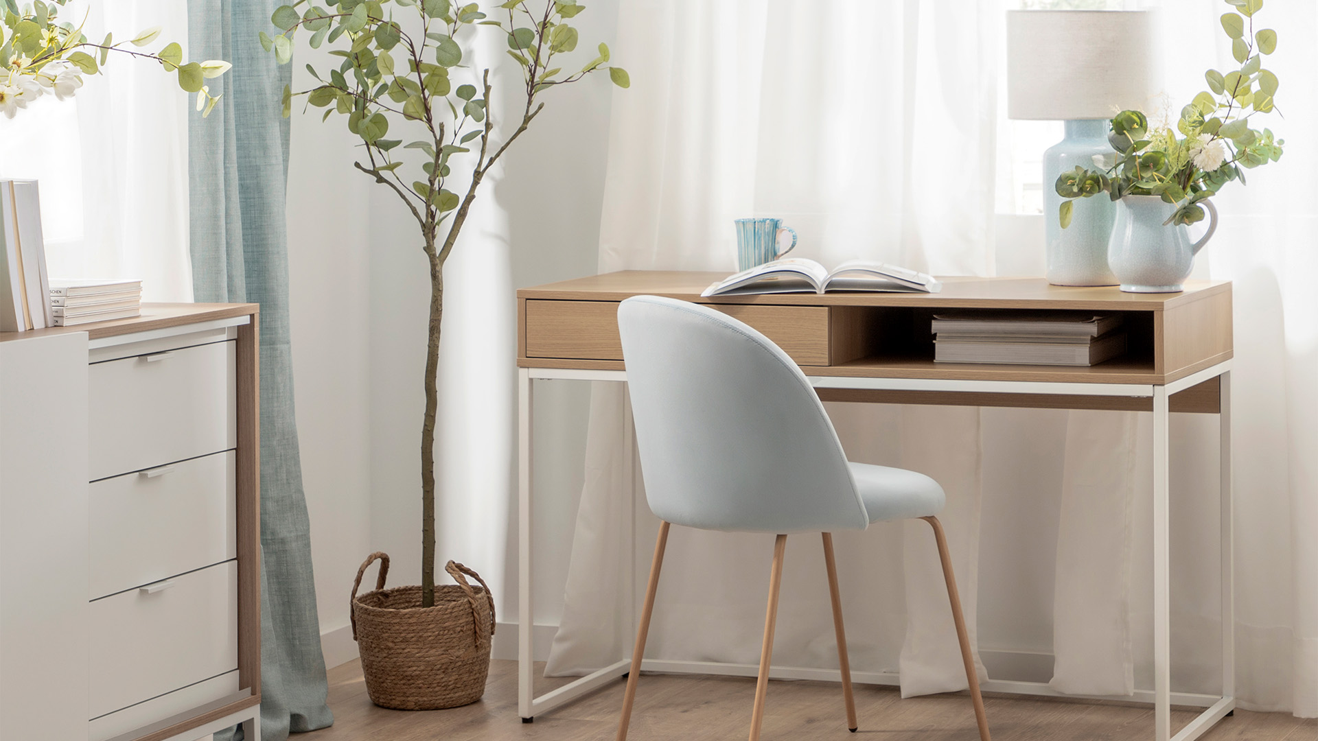 Schreibtisch aus naturfarbenem Holz mit weißem Bein