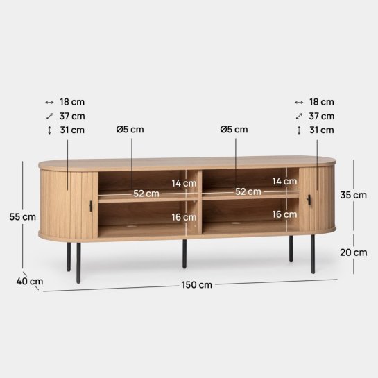 Bringen Sie mit dem TV-Möbel Breda 150 aus Holz in der Farbe Natur einen modernen Touch in Ihr Wohnzimmer. Sein abgerundetes Design und seine zwei Schiebetüren im Stil von Rollläden sorgen nicht nur für eine besondere Note, sondern bieten auch einen großzügigen Stauraum. Kombinieren Sie es mit dem Sideboard Breda für einen kompletten Look, bei dem Funktionalität und Stil harmonisch verschmelzen.
