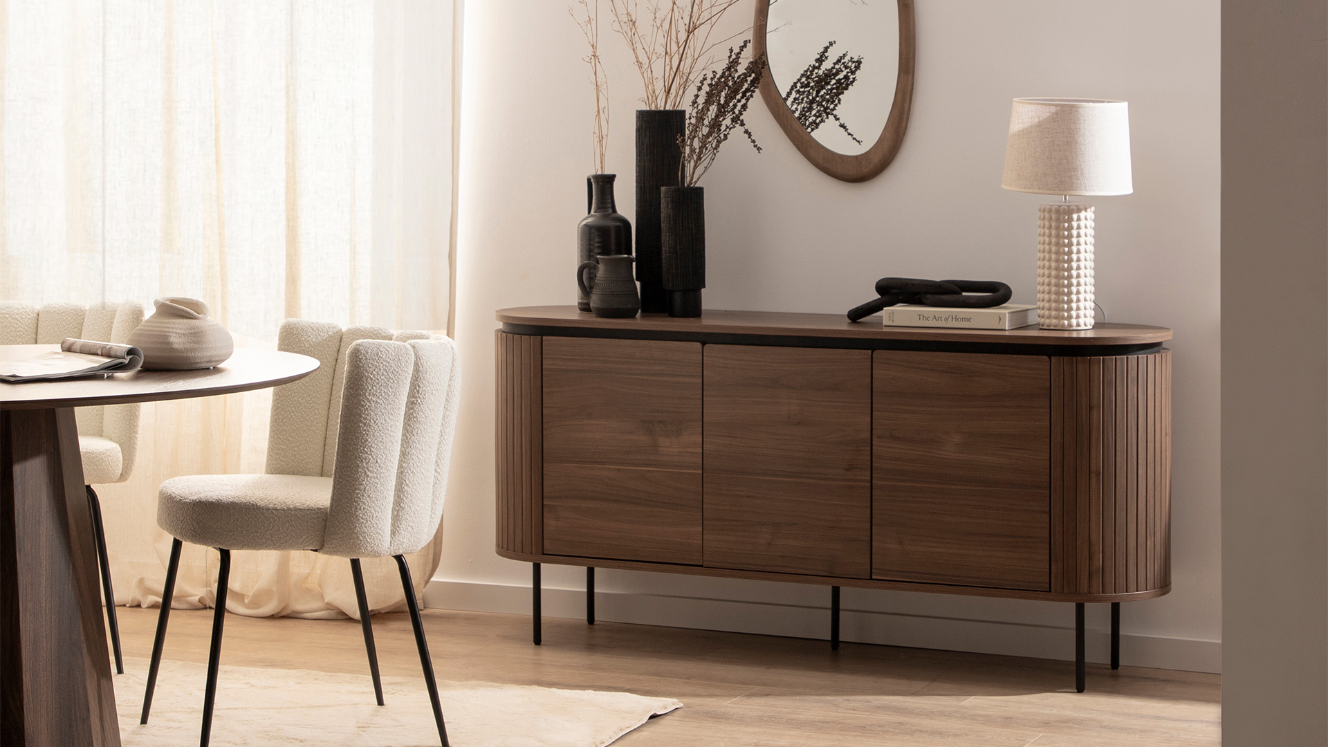 El aparador Helios en madera color nogal fusiona elegancia y funcionalidad con su diseño de líneas suaves y forma redondeada. Sus tres puertas ocultan un amplio espacio de almacenamiento interno, perfecto para mantener todo en orden y al alcance de la mano. Ideal para cualquier habitación, este aparador se integra a la perfección con el resto de la colección para lograr un look armonioso y estilizado.