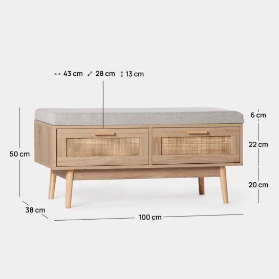 Banco infantil con almacenaje en madera color natural y ratán natural