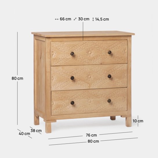La cómoda en madera de mango de 3 cajones Nala es el complemento perfecto para completar la decoración de tu dormitorio. Sus tres amplios cajones te ayudarán a mantener el orden en el dormitorio. Ha sido fabricada artesanalmente con madera de mango, por lo que las vetas de la madera pueden variar ligeramente de una pieza a otra. Para mayor estabilidad, recomendamos su anclaje a pared.