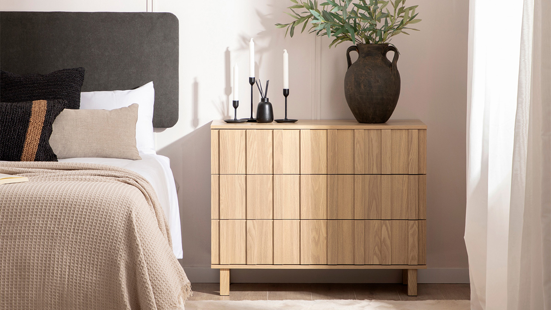 La cómoda Otto, con acabado en madera de color natural, destaca por sus líneas minimalistas que evocan equilibrio y simplicidad. Su diseño limpio y elegante la convierte en la opción ideal para aportar calidez a tu dormitorio. Ofrece múltiples cajones espaciosos para organizar tu ropa, accesorios y objetos personales de forma ordenada y accesible. ¡Échale un vistazo al resto de la colección Otto y consigue el look completo para tu hogar!