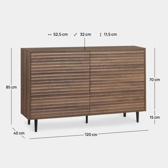 Transforma tu dormitorio con la cómoda Evoke, que presenta un acabado en madera color nogal con estilizadas patas metálicas negras. Su distintivo detalle ondulado brinda textura y carácter, convirtiéndola en una pieza única que aporta personalidad a tu habitación. Cuenta con seis amplios cajones que ofrecen almacenamiento práctico y ordenado para tu ropa, accesorios y objetos personales. Explora el resto de la colección Evoke y desarrolla un ambiente sofisticado y contemporáneo para tu hogar.