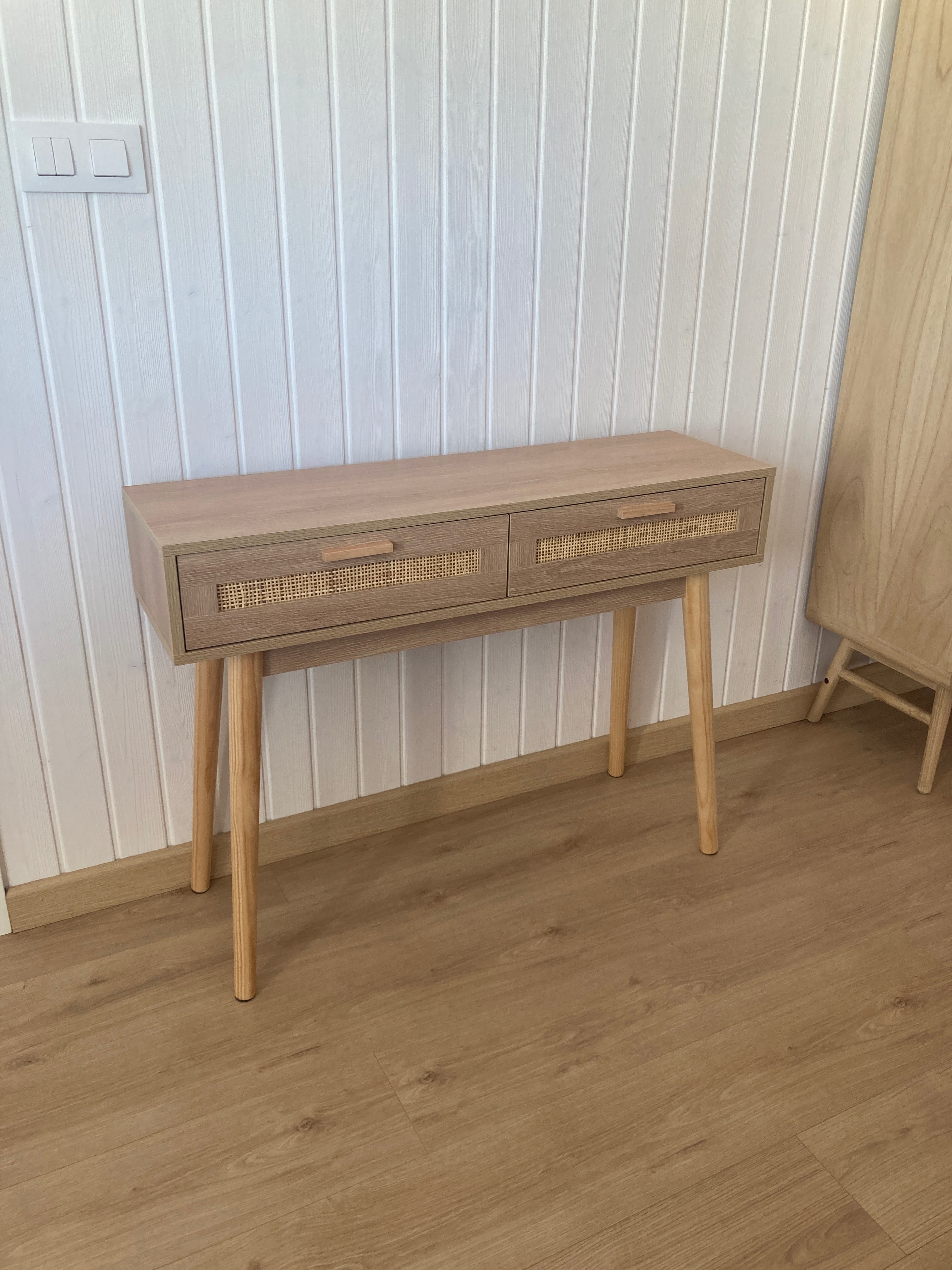 Mueble recibidor/escritorio en madera color natural y ratán natural