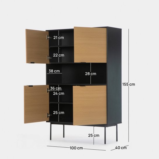 La vitrina Copenhague de estilo industrial derrocha tendencia, y es que la combinación de roble y negro es pura actualidad. Está dotada de cuatro puertas y baldas interiores dónde poder guardar lo que desees. Es una pieza de gran capacidad que puede emplazarse tanto en un comedor, como en un despacho u oficina.