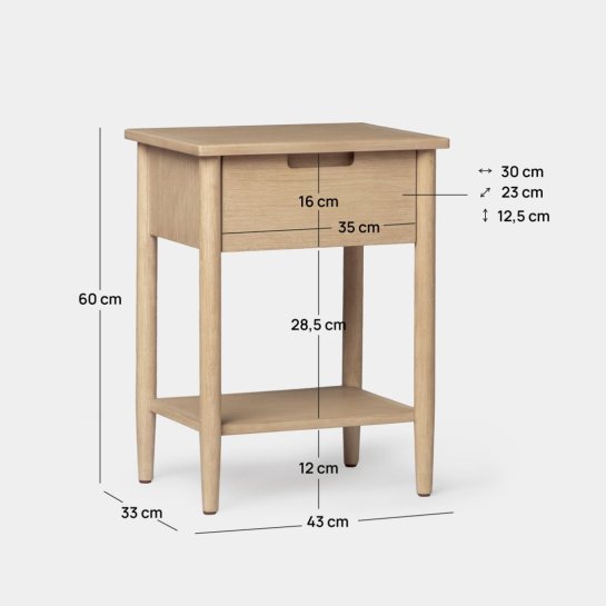 La mesita de noche Kenan en chapa de pino y madera de abedul es la pieza ideal para completar la decoración de tu dormitorio. Cuenta con un cajón y un práctico estante inferior en el que podrás dejar todo lo que quieras tener a mano. Su estilo minimalista se adapta con armonía a una variedad de estilos decorativos y aporta luminosidad y orden al dormitorio. También está disponible en blanco. ¡Elige el acabado que mejor se ajuste a tus preferencias!