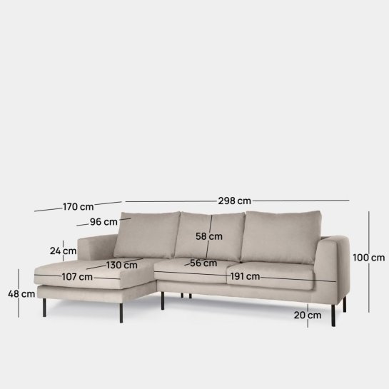 El sofá chaise longue tres plazas beige Emma es ideal para completar tu salón. Es cómodo, práctico y muy de tendencia. También lo puedes encontrar disponible en color gris.