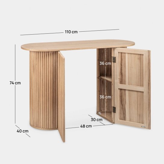 La consola Trena, elaborada en madera de paulownia, presenta un diseño moderno y funcional. Equipado con dos compartimentos ocultos, es ideal para almacenar objetos que prefieres mantener fuera de la vista, contribuyendo a un ambiente ordenado y acogedor. Su estética versátil se adapta a diferentes estilos de decoración, convirtiéndola en una pieza perfecta para el salón, el recibidor o cualquier espacio que necesite un toque de sofisticación y organización.