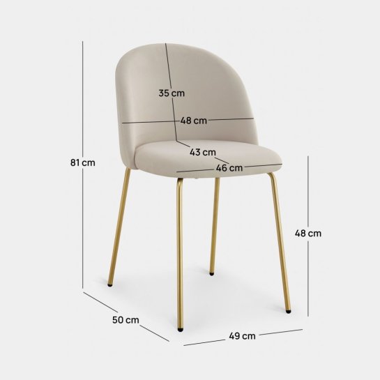 La silla de comedor Olivia tapizada en terciopelo beige con pata dorada tiene un diseño elegante y sencillo inspirado en los años 50. Su respaldo corto y redondeado unido al diseño de sus patas cónicas despuntadas recuerdan a esos modelos de sillería sofisticados y funcionales adaptables a cualquier estilo.