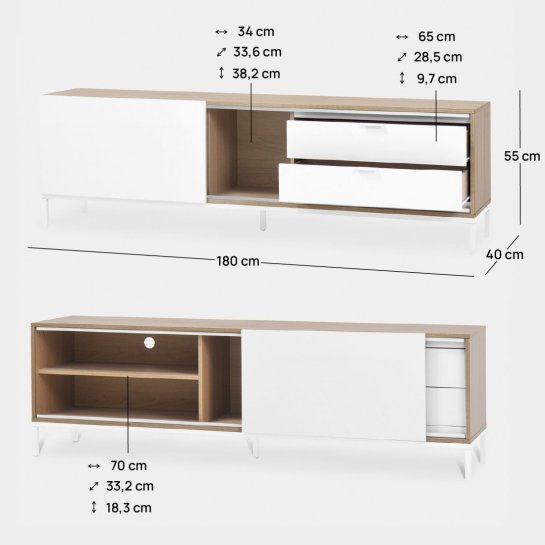 Transforma tu hogar con el mueble TV 180 en madera color natural y blanco Denver. Su diseño sencillo aporta elegancia y estilo a cualquier espacio. La puerta corredera y los cajones permiten mantener de forma ordenada los dispositivos y accesorios de tu TV, perfectos para quienes prefieren esconderlos. Combina esta pieza con otras de la colección y crea un ambiente armonioso y único en tu salón.