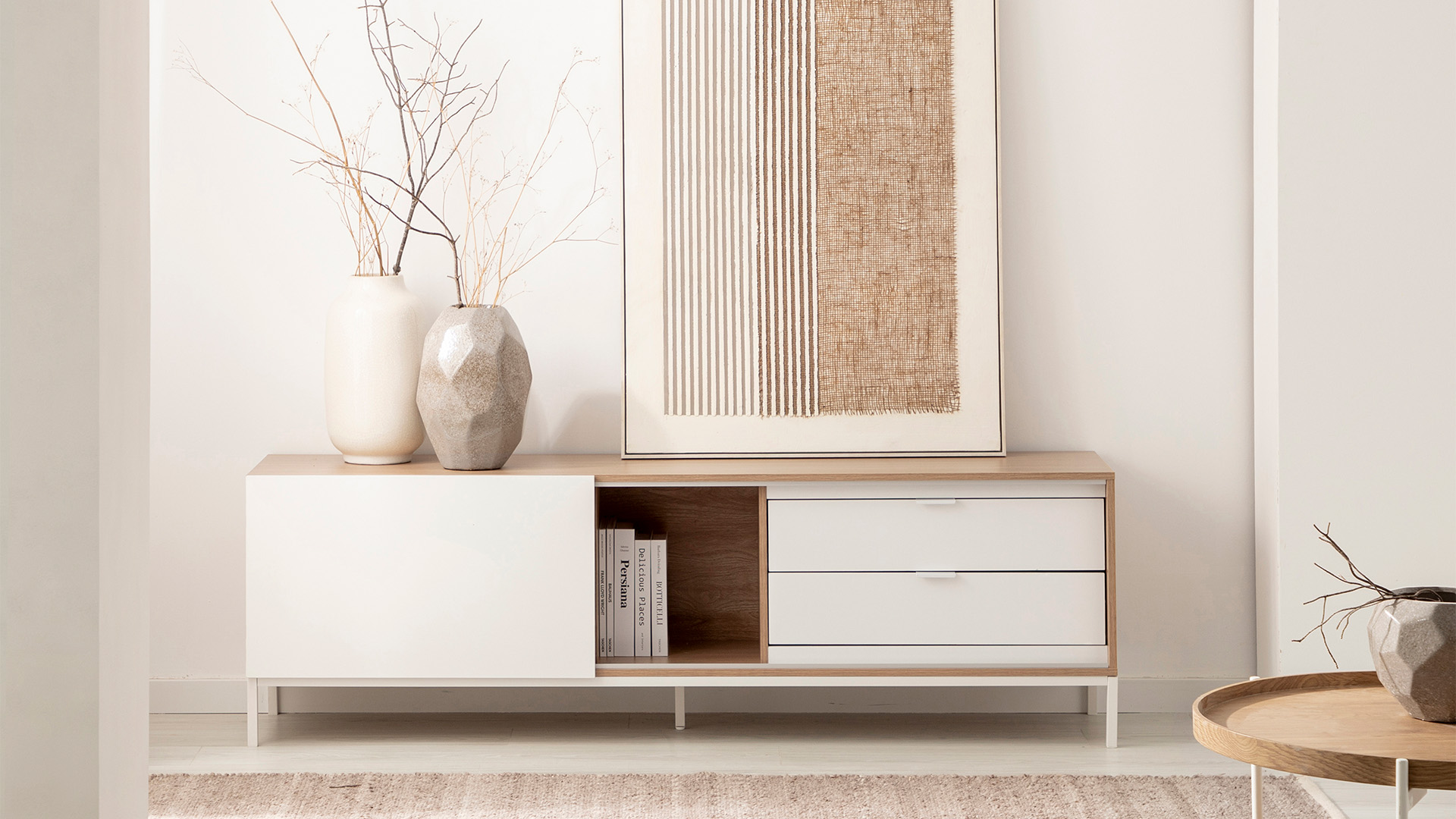 Mueble TV 180 con puerta corredera en madera color natural y blanco