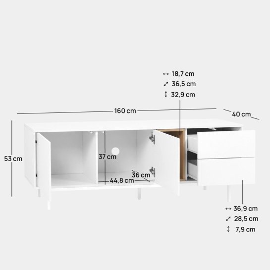 Añade un toque único a tu hogar con el mueble TV 160 Hazan, acabado en madera color blanco y natural. Ofrece amplio espacio de almacenamiento para mantener tus dispositivos organizados y fuera de la vista. Combínalo con el resto de la colección para crear una estancia armoniosa.