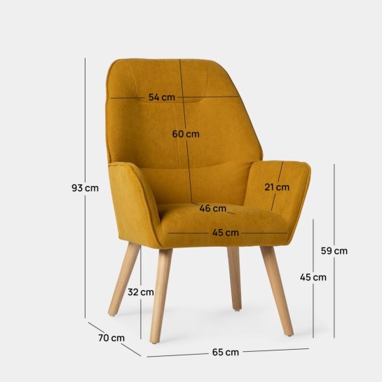 La butaca de lectura Valery tapizada en color mostaza encaja en cualquier salón, dormitorio o recibidor. Tiene un respaldo alto y unos mullidos reposabrazos que hacen que sea muy cómoda y confortable. Está disponible en diferentes tapizados para que puedas escoger el que mejor encaje con tu estilo.