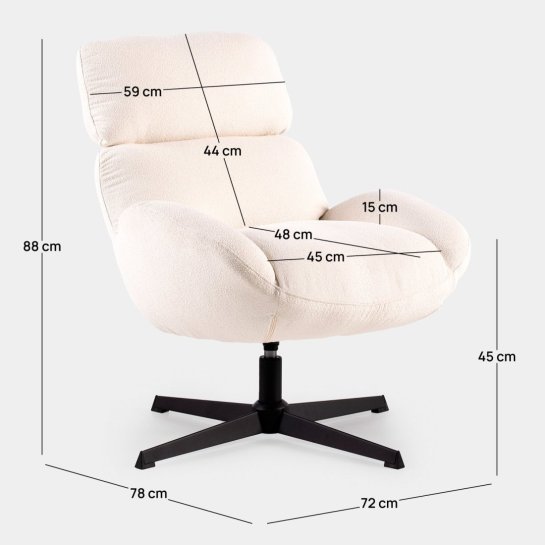 La butaca Rik es ideal si buscas elegancia en estado puro. Su tapizado beige y líneas depuradas aportan sofisticación a cualquier rincón de tu hogar. Gracias a su base giratoria tendrás la flexibilidad de moverte según tus necesidades. Su amplio asiento y formas envolventes están pensados para garantizarte el máximo confort. Con esta butaca cada momento de descanso se convierte en algo especial.