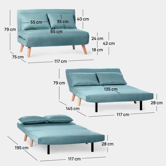 El sofá cama de 2 plazas azul Noa es la pieza ideal para cualquier dormitorio o sala de estar de dimensiones reducidas. Gracias a su sistema de apertura clic clac podrás convertirlo en cuestión de segundos en una cama supletoria con capacidad para dos personas. Incluye dos cojines rectangulares con fundas extraibles. Está disponible en varios acabados para que puedas escoger el que mejor se ajuste a tu estilo.
