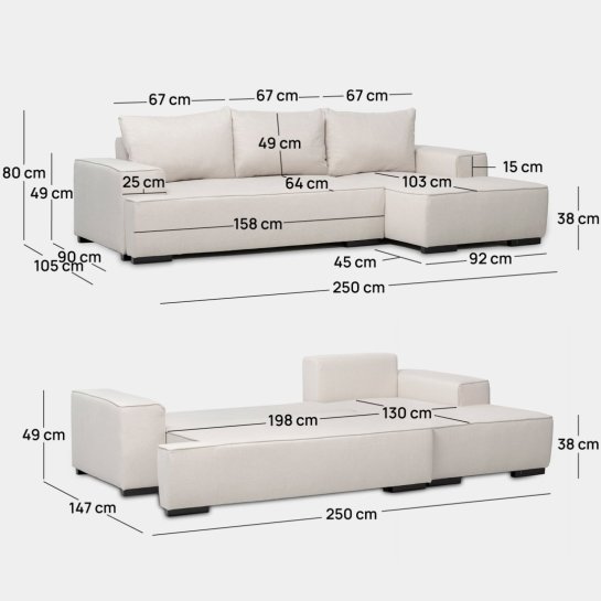 El sofá cama chaise longue derecha de 3 plazas en color beige Alan es la combinación perfecta de estilo y funcionalidad. Este sofá no solo añade un toque de sofisticación a tu salón, sino que también ofrece una versatilidad incomparable gracias a su ingenioso diseño convertible. En un abrir y cerrar de ojos, podrás transformar el cómodo sofá en una cama espaciosa, brindando una solución práctica y acogedora para alojar a tus invitados. La chaise longue, al mirar de frente el sofá, queda ubicada a la derecha.