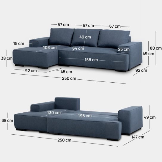 El sofá cama chaise longue izquierda de 3 plazas en color azul Alan es la combinación perfecta de estilo y funcionalidad. Este sofá no solo añade un toque de sofisticación a tu salón con su vibrante tono azul, sino que también ofrece una versatilidad incomparable gracias a su ingenioso diseño convertible. En un abrir y cerrar de ojos, podrás transformar el cómodo sofá en una cama espaciosa, brindando una solución práctica y acogedora para alojar a tus invitados. La chaise longue, al mirar de frente el sofá, queda ubicada a la izquierda.