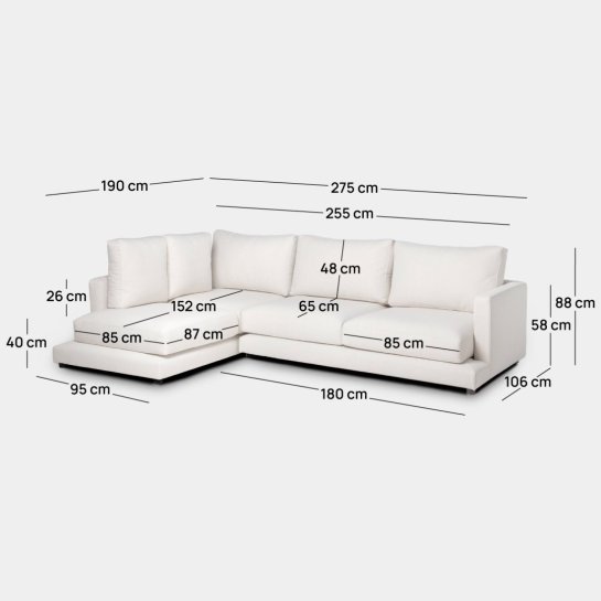 El sofá chaise longue de 3 plazas Varyag, con su diseño de líneas rectas y estilo minimalista, es la elección ideal para completar la decoración de tu salón. La chaise longue se encuentra en el lado izquierdo al mirar el sofá de frente, y ofrece un espacio amplio y cómodo que invita a relajarse por completo.