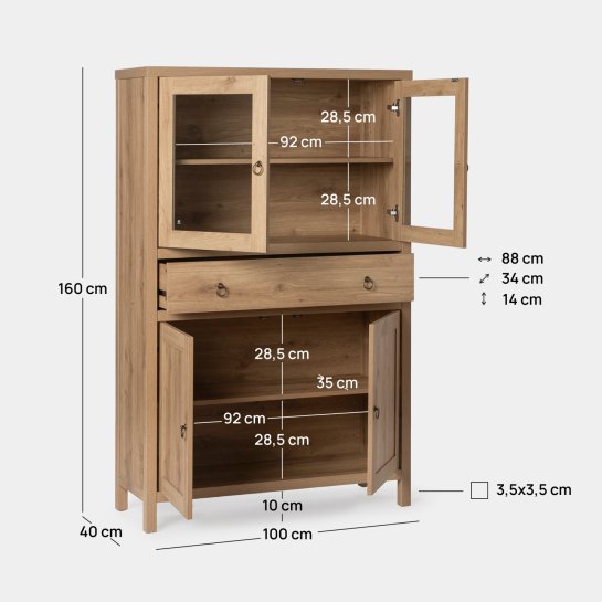 Añade un toque de calidez y estilo a cualquier espacio con la vitrina en madera color natural Livorno. Cuenta con dos amplias puertas acristaladas en las que podrás exhibir tu mejor vajilla, y con dos puertas y un cajón que ofrecen espacio de almacenamiento discreto para todo aquello que prefieras mantener fuera de la vista. En la parte inferior del cristal, encontrarás un grabado que certifica su cumplimiento con los más altos estándares de seguridad y calidad. Combínala con los muebles del resto de la colección y ¡consigue el look completo!