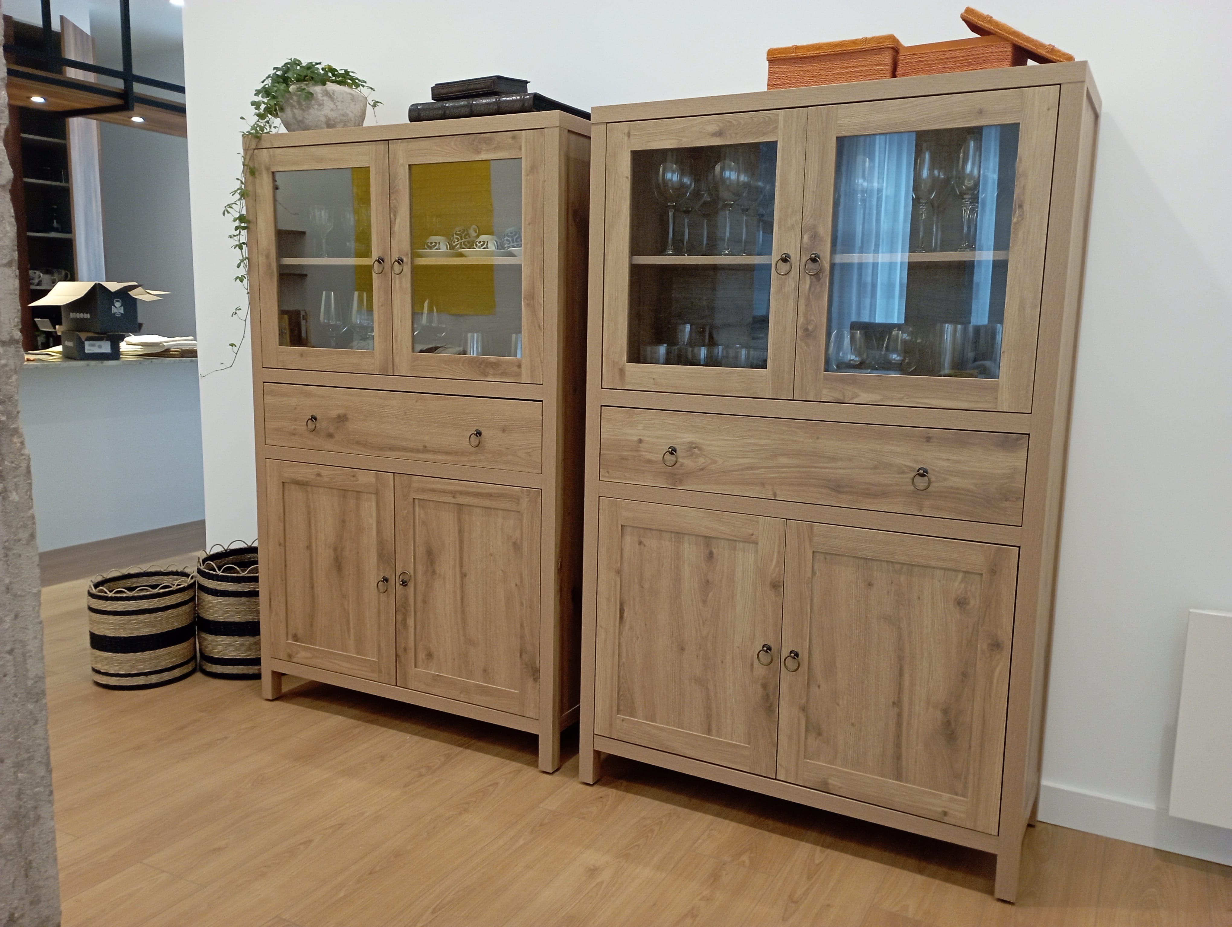 Vitrina en madera color natural con puertas de cristal