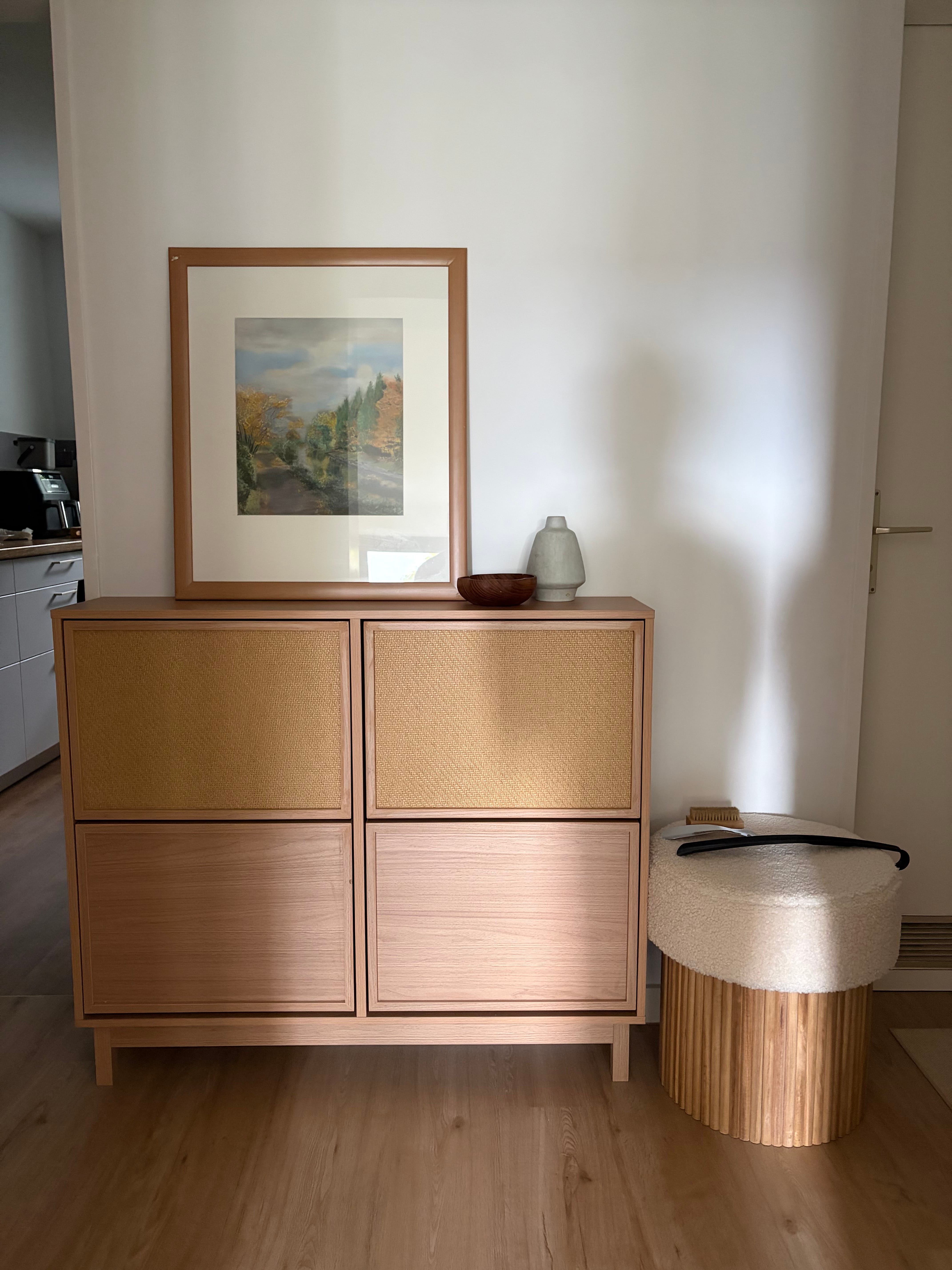 El zapatero doble Bora, confeccionado en madera color natural y fibra natural, es la opción perfecta para aquellos que buscan una solución de almacenamiento de calzado amplia y elegante. Su diseño robusto y estilizado cuenta con cuatro puertas abatibles, ofreciendo un amplio espacio para organizar hasta 24 pares de zapatos. Cada compartimento incluye separadores ajustables y extraíbles, lo que permite guardar tanto zapatos de tamaño estándar como calzado de mayor volumen. Completa tu hogar con los demás muebles de la colección Bora y crea un ambiente armonioso y lleno de estilo. Para garantizar su estabilidad y seguridad, es imprescindible fijarlo a la pared.