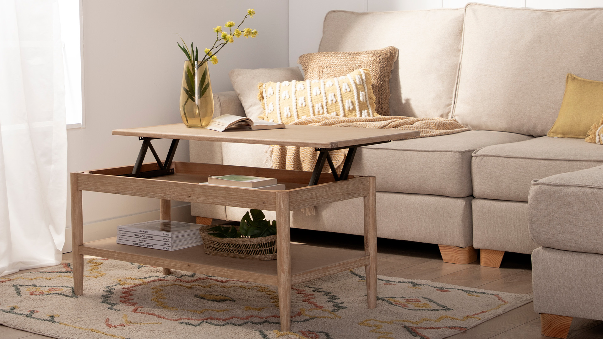 The Ava lift-top coffee table in pine veneer and birch wood is the perfect combination of functionality and design. Its lift-top allows you to work on your computer or comfortably eat from your sofa. In addition, it has a spacious drawer that provides extra storage. It is available in a two-tone finish, choose the one that best fits your style.