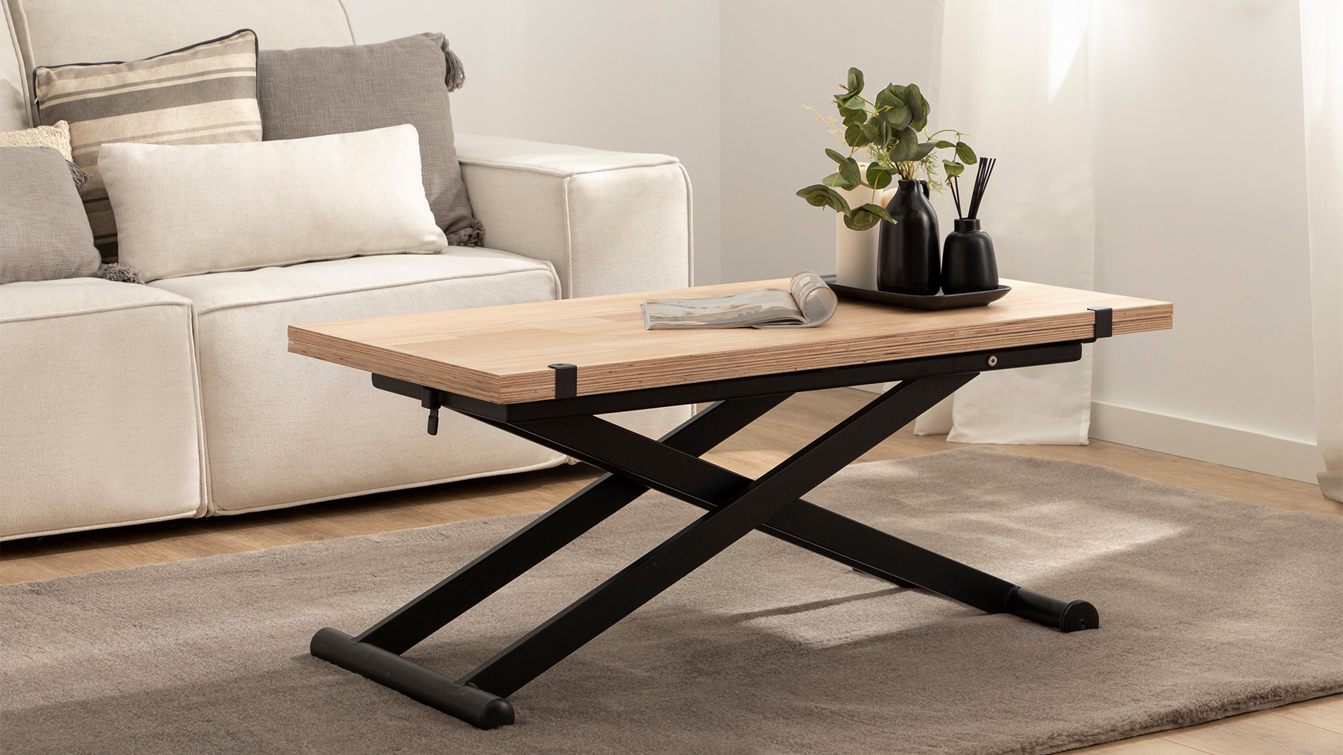 Make the most of your home space with the Tapi lift and extendable coffee table. Its metal structure allows you to raise it to the height of a dining table, while its extendable oak wood top provides the additional space you need. This multi-position table is ideal as a coffee table, dining table, or even a desk.
