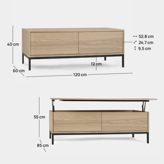 Elevate the style and elegance of your living room with the Remi lift-up coffee table, finished in natural wood and black metal legs. Its lift-up function will allow you to work from the sofa, study or dine in comfort, while its drawers offer space to organise books, remotes and other accessories in a tidy and accessible way. A practical piece that combines functionality with a distinctive design. Combine it with other pieces from the collection to create a stylish and practical environment.