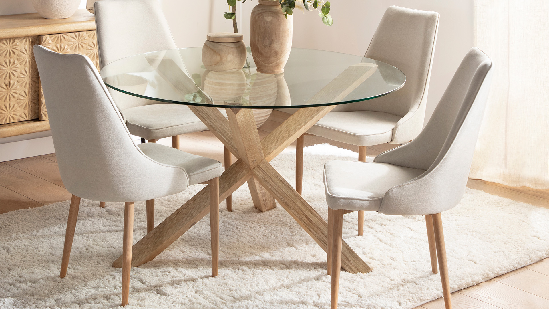 The Agnes dining chair upholstered in beige polyester with a natural leg features a design with a vintage feel and completely timeless lines. In addition to adding elegance and personality to your dining room, its small, contoured shape in the lumbar area provides comfort that will make it your best ally during long meals with family or friends.