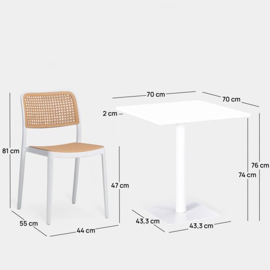 Take advantage of this Set! The Kaira chair is ideal if you are looking for comfort, elegance, and functionality. It is stackable, made of polypropylene, a very practical option for any space. The Thule square garden table, made entirely of metal, is perfect for being outdoors and enduring the elements. You can also find the Set in black and choose the option you like best.