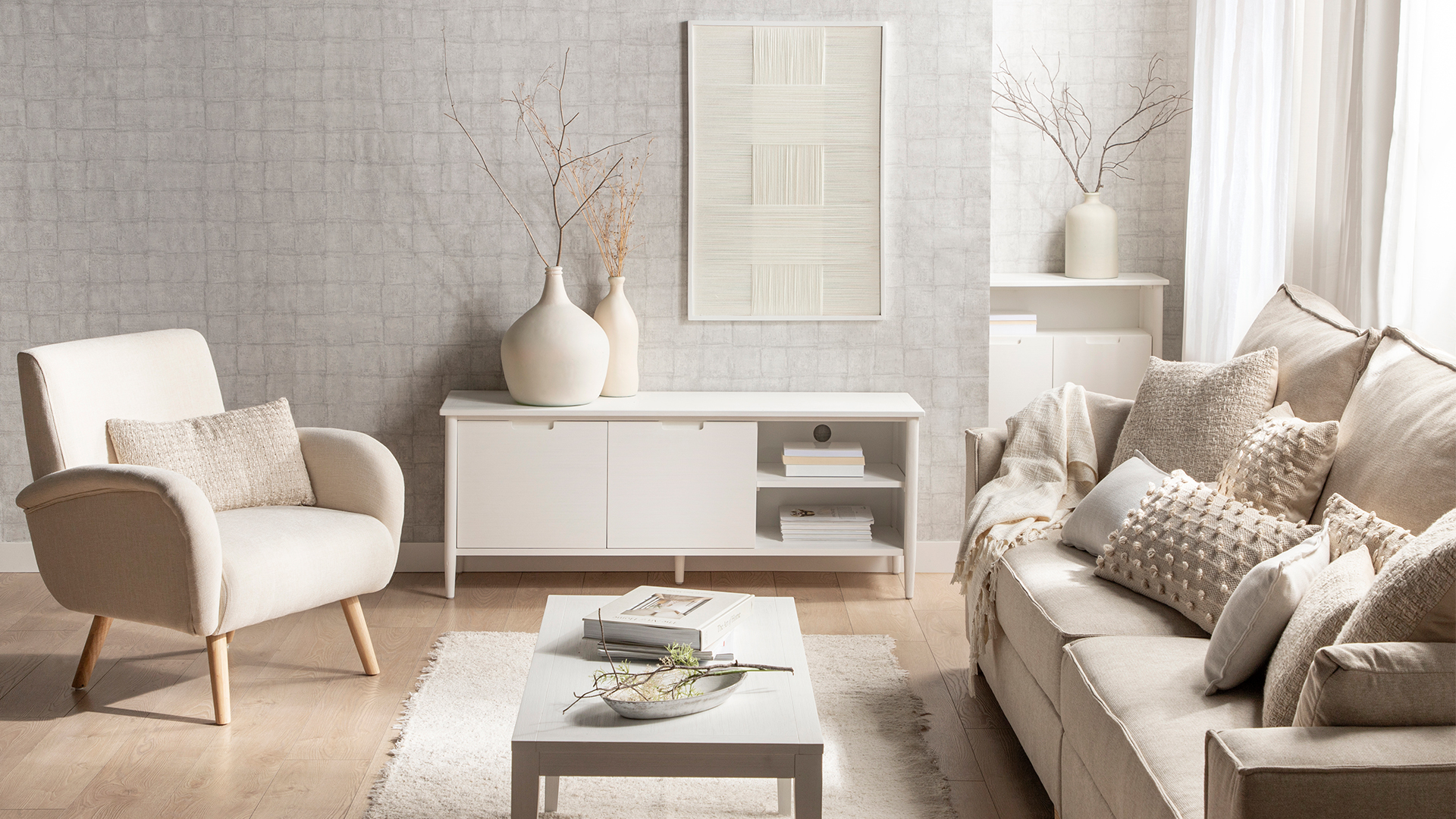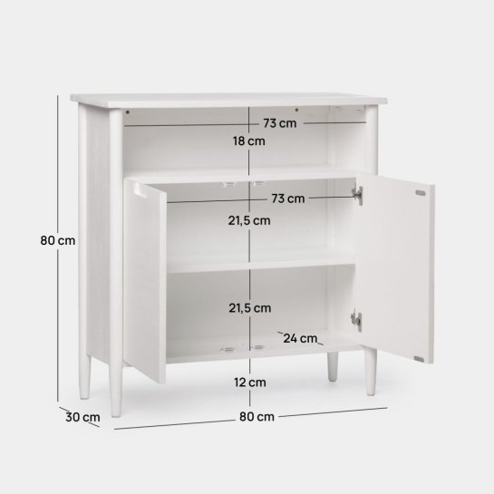 The white Kenan pine veneer and birch wood entryway furniture offers an ideal solution for additional storage in the living room, dining room, or office. Its visible shelf is perfect for displaying books or decorative items, while its two doors allow for storage of items that you do not want to have in plain sight. For greater stability of the furniture, we recommend anchoring it to the wall.