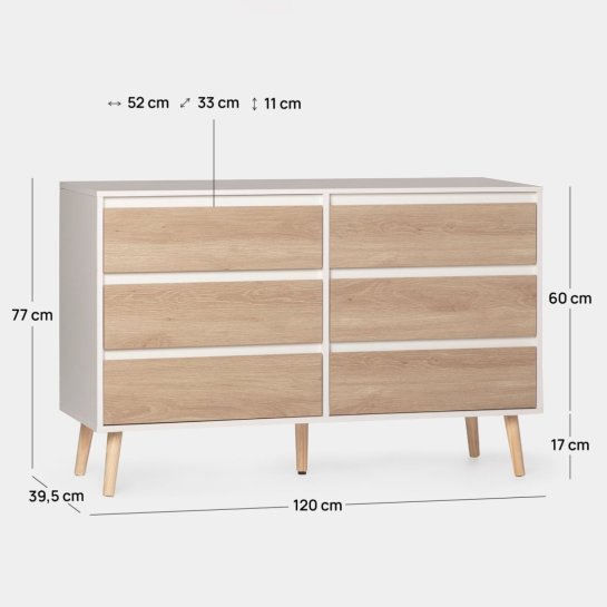 With the white and natural wood dresser Kemi, you will create a fresh and bright atmosphere in your child's room. Its Nordic and simple design makes it a safe bet that will grow with them without going out of style. In addition, it has 6 spacious drawers where they can store all their clothes and keep their room perfectly organized.
