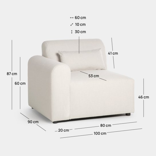 The Cillian left corner module stands out for its versatility and adaptability, making it an ideal option for any space. Its curved lines not only add a touch of modernity, but also wrap around the body, providing a comfortable and relaxing resting experience. In addition, it includes a decorative cushion that adds an extra touch of comfort and elegance.