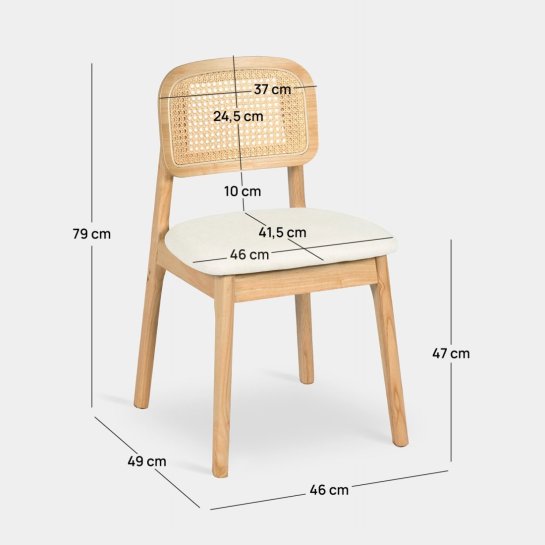Take advantage of this set! The Tove dining chair, made of solid rubberwood with a beige upholstered seat, combines functionality and elegance in an exceptional way. Its backrest features synthetic rattan details that add character and distinction. Thanks to its timeless style, it fits perfectly into any setting. As it is made of natural wood, there may be slight variations in colour. It is also available in walnut so you can choose the option you like best.