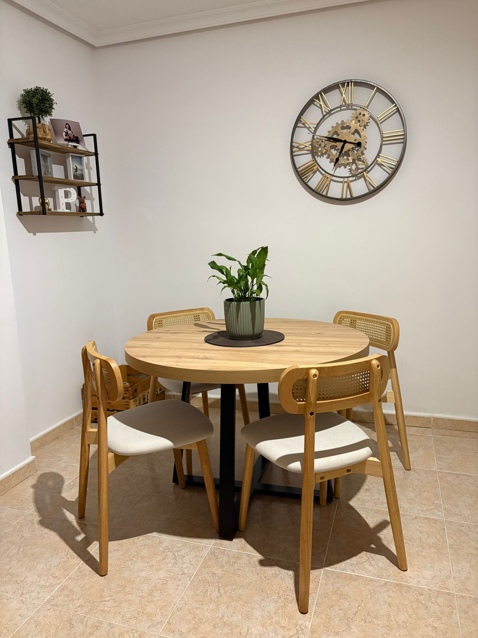 Take advantage of this set! The Leyre dining chair, made of solid rubberwood with a beige upholstered seat, offers the perfect balance between style and comfort. Its backrest features rattan details that add a natural and sophisticated touch. With a timeless and versatile design, it fits easily into any living room. As it is made of natural wood, there may be slight variations in tone. It is also available in a walnut finish, so you can choose the one you like best.