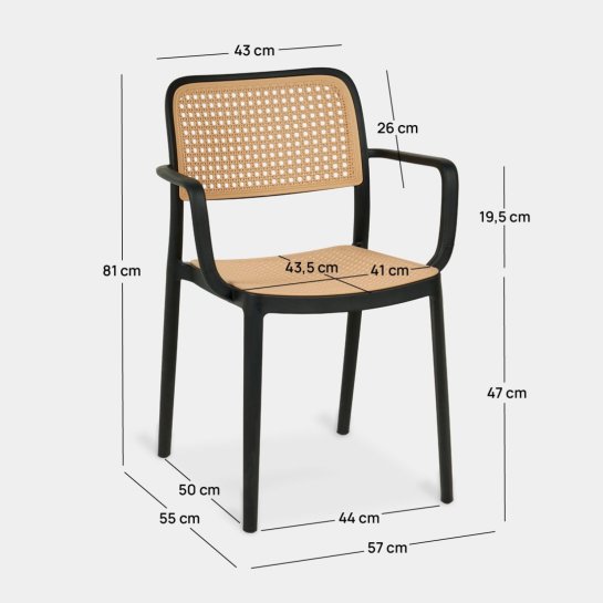 Take advantage of this pack! The Kaira dining chair with armrests is perfect for adding a unique and vintage touch to your home. Its versatility makes it ideal for any space, whether in your living room, kitchen, or terrace. Designed to mimic the shape of natural rattan, but with the durability and resistance of polypropylene. It is also stackable and lightweight, making it easy to transport and store. It is also available in white, so you can choose the model that best suits your tastes.