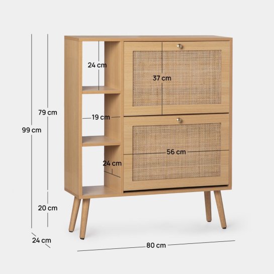 Add a touch of natural charm to your home while keeping your shoes organized and accessible with the narrow Demi shoe rack. Made with natural rattan, this piece of furniture is perfect for small spaces. It features two doors and three shelves, providing enough space to store up to 11 pairs of shoes. Each compartment has a removable divider so you can store larger shoes. The maximum shoe size it can accommodate is size 44.