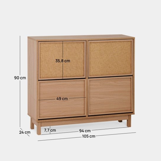 The Bora double shoemaker, made of natural wood and natural fiber, is the perfect option for those looking for a spacious and elegant shoe storage solution. Its sturdy and sleek design features four folding doors, offering ample space to organize up to 24 pairs of shoes. Each compartment includes adjustable and removable dividers, allowing you to store both standard-sized shoes and larger footwear. Complete your home with the other furniture pieces from the Bora collection and create a harmonious and stylish atmosphere. To ensure its stability and safety, it is essential to secure it to the wall.