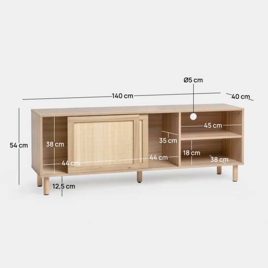 Add personality and style to your home with the 140 Timor TV cabinet. Finished in natural wood and bamboo, it is perfect for adding an original and cozy touch to your living room. It has two sliding doors, two shelves, and a practical cable hole, ideal for organizing all your devices and keeping the space tidy and within reach. Achieve a harmonious decoration by combining it with the rest of the pieces of the collection!