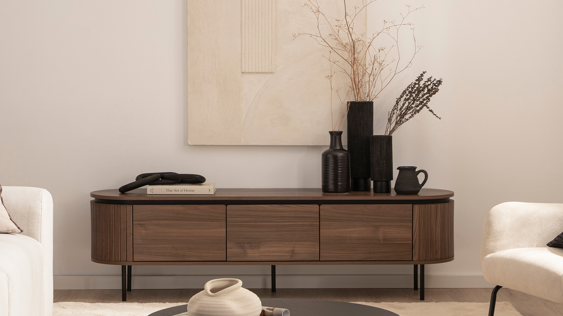 The Helios TV cabinet in walnut wood combines elegance and functionality in a design with smooth lines and a rounded shape. Its doors with rounded edges not only enhance its style, but also allow for easy access to the spacious storage space. Combine it with the rest of the collection to achieve a harmonious and stylish look.