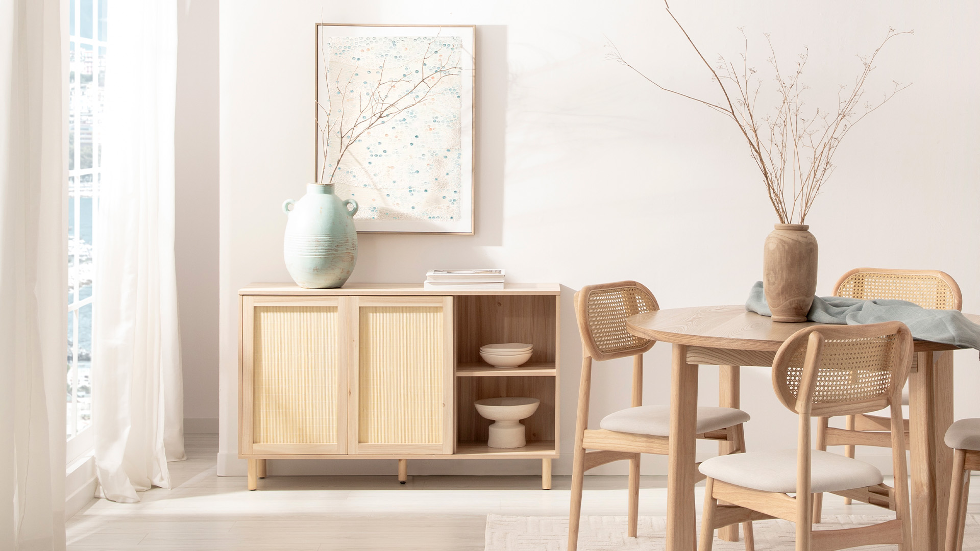 Buffet avec porte coulissante en bois couleur naturelle et bambou naturel