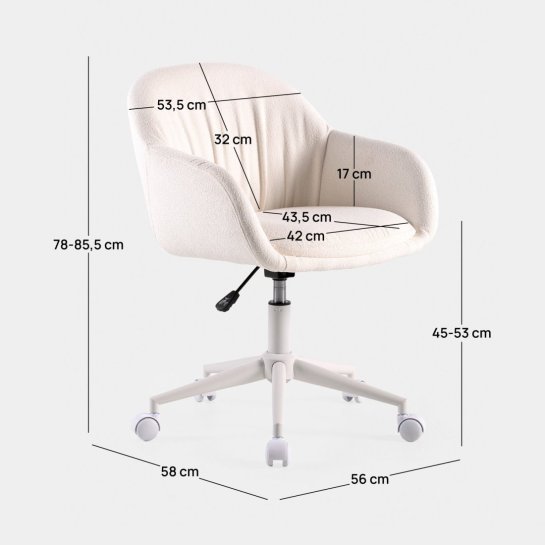 La chaise de bureau Tasia allie style et polyvalence dans votre espace de travail. Son revêtement beige et son toucher doux créent une ambiance chaleureuse et sophistiquée, conçue pour votre confort maximal. Avec ses accoudoirs, sa hauteur réglable, sa base pivotante et ses roulettes, vous bénéficierez de la mobilité dont vous avez besoin pour travailler confortablement. Elle est également disponible en vert menthe, afin que vous puissiez choisir l'option qui vous plaît le plus.