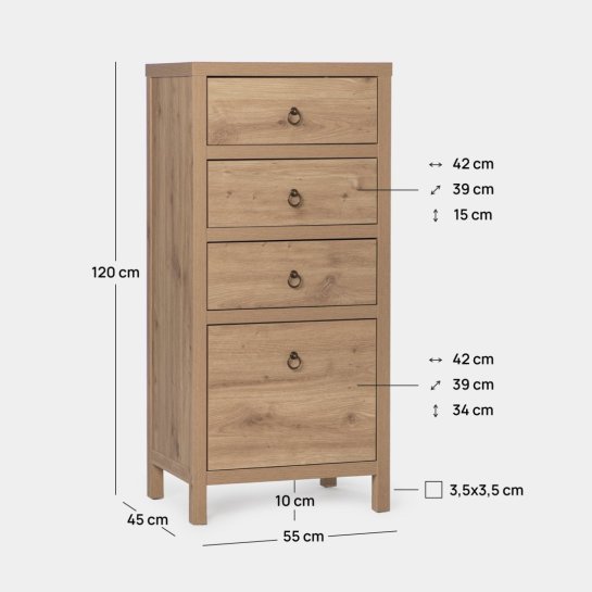 Le chiffonnier Livorno 4 tiroirs en bois couleur naturelle est idéale pour ranger votre chambre à coucher. Grâce à sa grande capacité de rangement, elle optimise l'espace disponible. Combinez-la avec d'autres meubles de la même collection et créez une atmosphère charmante et harmonieuse dans votre maison.