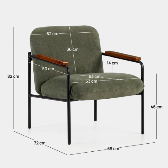 Le fauteuil de lecture Kai est la combinaison parfaite entre élégance et confort. Son revêtement vert s'associe à ses pieds métalliques noirs et à ses accoudoirs en bois pour créer un look sophistiqué qui s'intègre parfaitement à n'importe quel environnement. Son assise large et son dossier légèrement incliné sont conçus pour vous offrir un confort maximal. Avec son design épuré et moderne, ce fauteuil créera dans votre maison un coin confortable et plein de personnalité. Il est également disponible en beige, pour que vous puissiez choisir l'option qui vous plaît le plus.