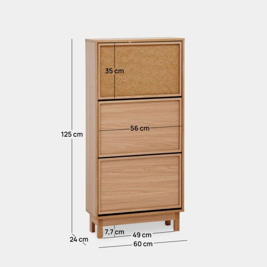 L'étagère à chaussures étroite Bora, fabriquée en bois de couleur naturelle et en fibres naturelles, est la solution parfaite pour garder vos chaussures bien rangées et accessibles dans les petits espaces. Son design compact et élégant comporte trois portes à charnières qui permettent de ranger jusqu'à 18 paires de chaussures. De plus, chaque compartiment comprend une cloison réglable et amovible, idéale pour ranger les chaussures plus grandes. Complétez votre intérieur avec d'autres meubles de la collection Bora pour un effet sensationnel. Pour garantir sa stabilité et sa sécurité, il est indispensable de le fixer au mur.