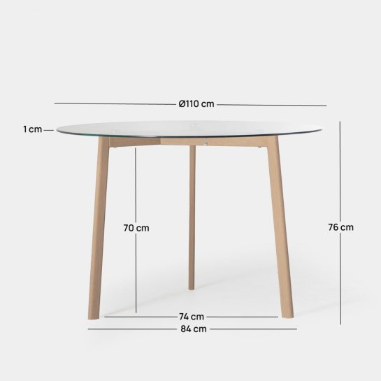 Donnez une touche moderne et accueillante à votre maison avec la table à manger ronde Eyre. Son plateau en verre trempé et ses pieds au fini naturel offrent la combinaison parfaite de résistance et de style. Son design apporte de l'espace à la pièce et peut accueillir jusqu'à 5 convives, idéal pour partager des moments spéciaux avec vos proches. Combinez-la avec le reste de la collection et créez une ambiance harmonieuse et élégante.
