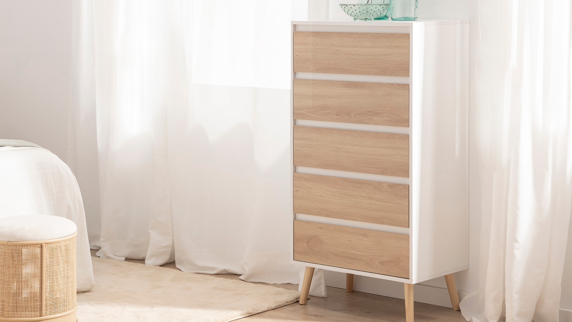 Aggiungi funzionalità e stile alla tua camera da letto con la cassettiera a 5 cassetti in legno bianco e naturale Kemi. Il suo design di stile nordico combina eleganza e praticità, perfetto per completare l'arredamento della tua camera da letto o cabina armadio. Offre ampio spazio di archiviazione per riporre i tuoi vestiti e accessori. Scopri il resto della collezione Kemi e ottieni una decorazione equilibrata e armoniosa nella tua casa.
