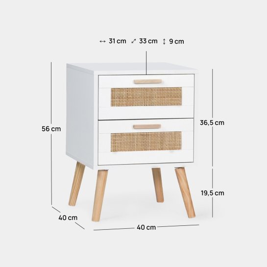 Comodino per bambini con 2 cassetti in legno bianco e rattan naturale